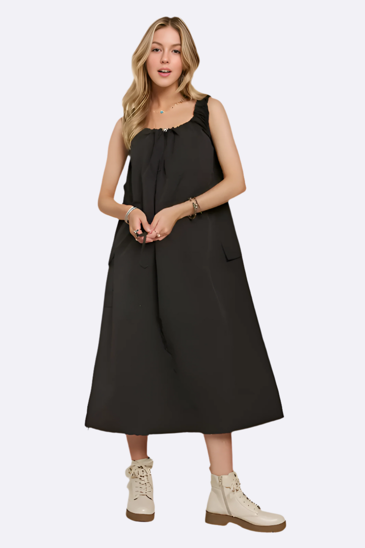 The Adora Dress is a stylish and practical piece for your wardrobe. The drawstring detail allows you to adjust the fit of the dress to your liking, adding a touch of versatility. The slit back adds a modern and edgy element, revealing a hint of skin and creating visual interest. The cargo-inspired design gives the dress a utilitarian and laid-back vibe, perfect for casual outings or everyday wear. Pair it with sneakers or sandals for a trendy and comfortable look.